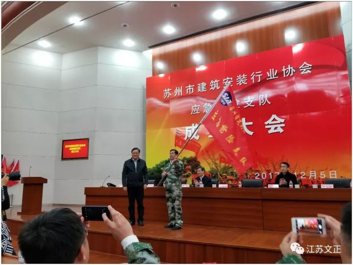 2017年12月5日国内建筑安装行业首支应急抢险支队在苏州成立。市委副书记朱民出席成立仪式,并查看了应急抢险支队的装备情况。副市长吴晓东为苏州市建筑安装行业协会应急抢险支队授旗。