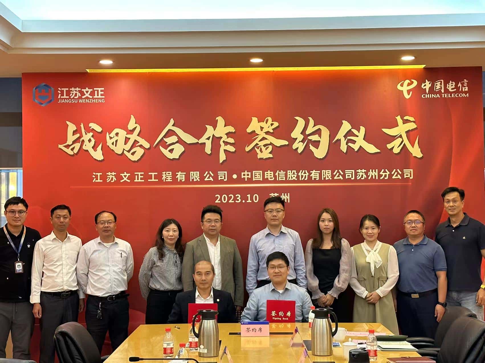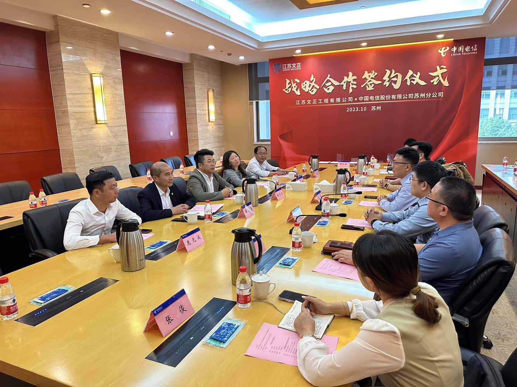 为深入学习贯彻习总书记考察江苏重要讲话精神,进一步深化、推进公司数字化转型战略,10月17日,公司董事长谢洪正,副总经理耿静、端方勇,工程部经理荣国峰、庞元成赴中国电信股份有限公司苏州分公司参观学习,并与中国电信股份有限公司苏州分公司签订战略合作协议。