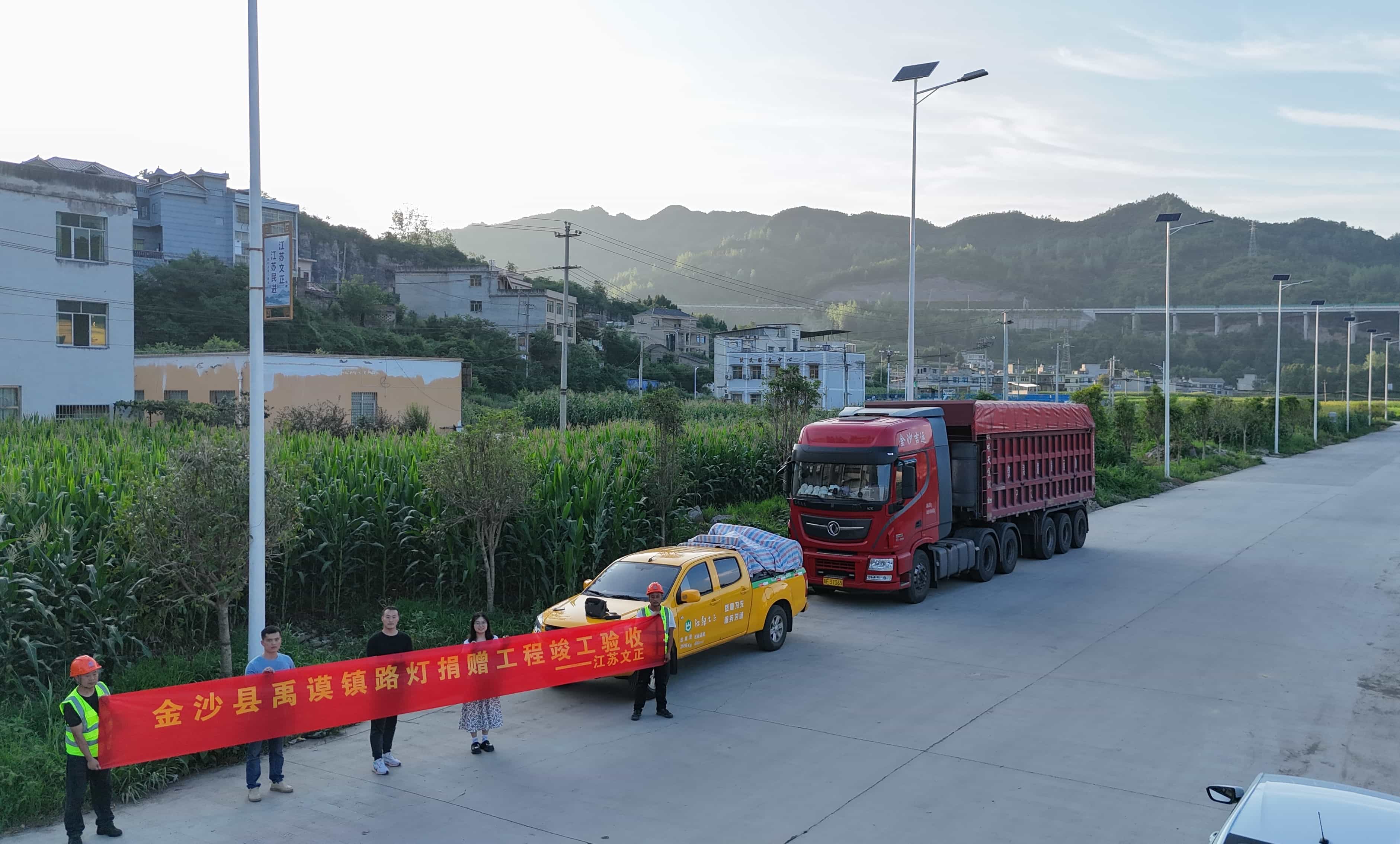 6月25日,物资顺利抵达禹馍。当地政府及村民代表热情迎接捐赠团队,并对江苏文正工程的善举表示感谢。为确保路灯尽快投入使用,公司派出专业安装团队随行,抵达后立即投入安装工作,与当地工作人员紧密配合,有序开展路灯安装。