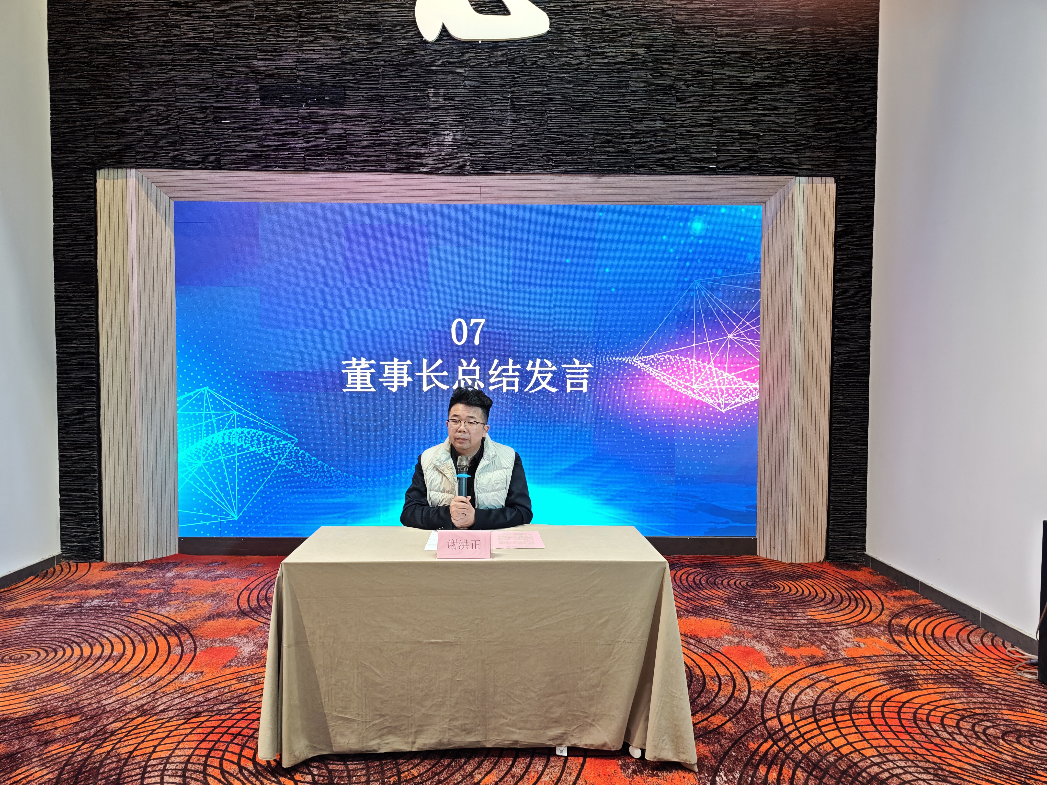 会议尾声,董事长谢洪正作总结发言。他感谢全体员工过去一年的拼搏,肯定大家在行业寒冬中的坚守与实干。